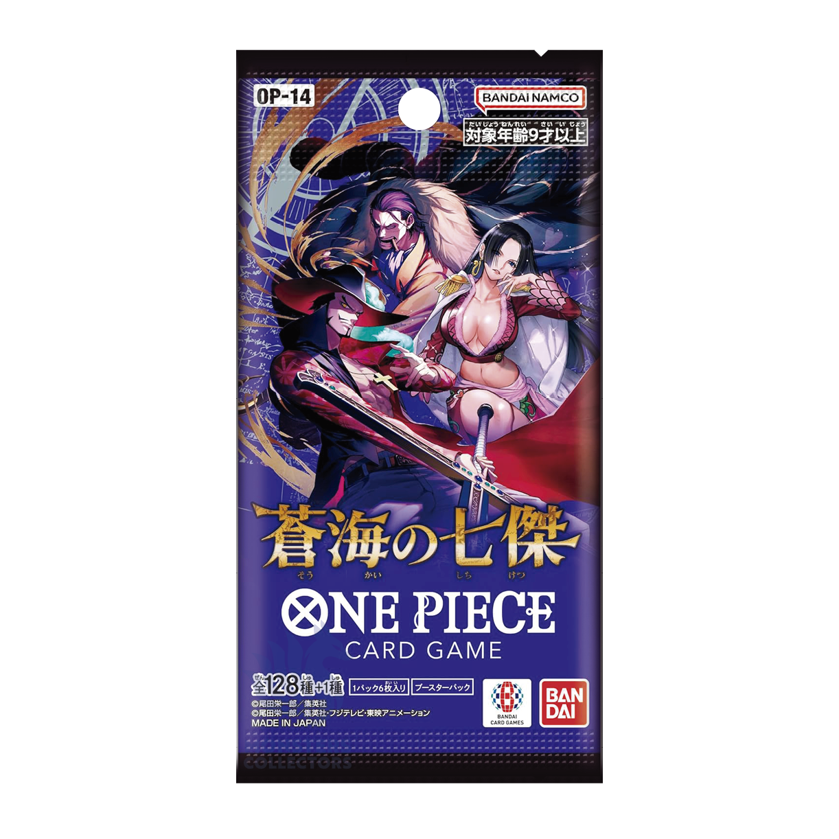 Sobre de One Piece OP14 Seven Warlords of the Sea en japonés. Desata el reinado del Caos y presencia cómo los villanos más temidos cambian el rumbo del Nuevo Mundo.